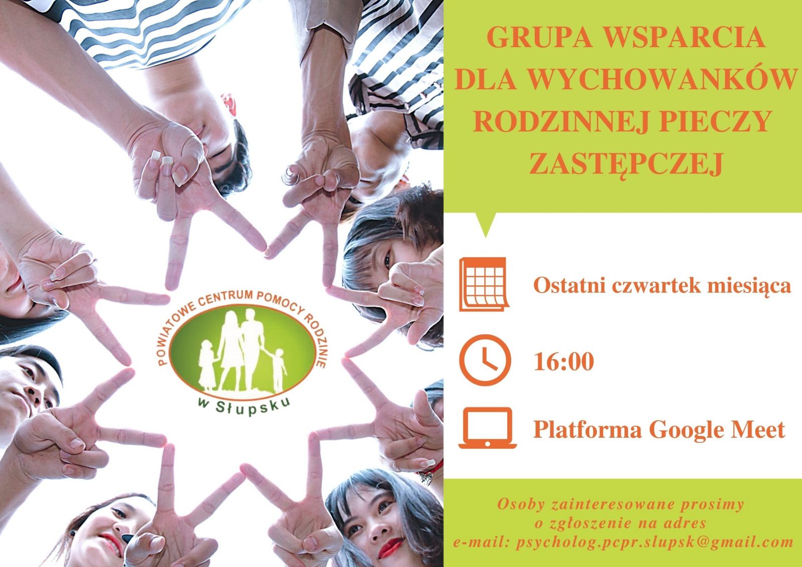 Przypominamy, że w dniu dzisiejszym odbędzie się spotkanie grupy wsparcia dla wychowanków rodzinnej pieczy zastępczej na Platformie Google Meet o godzinie 16.oo. Grupę prowadzi psycholog Katarzyna Gajewska. Serdecznie zapraszamy.